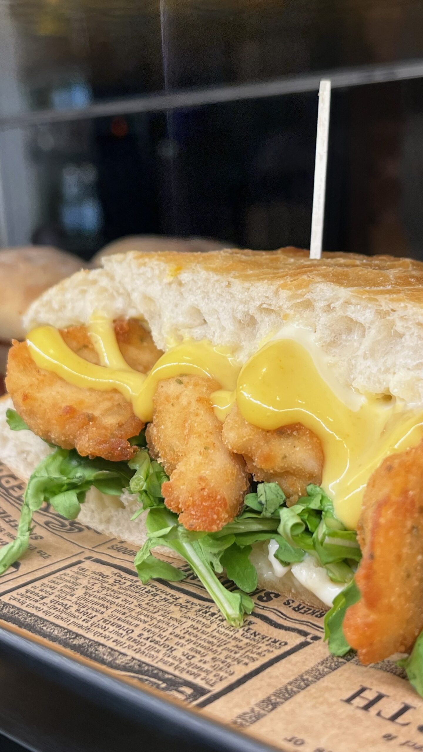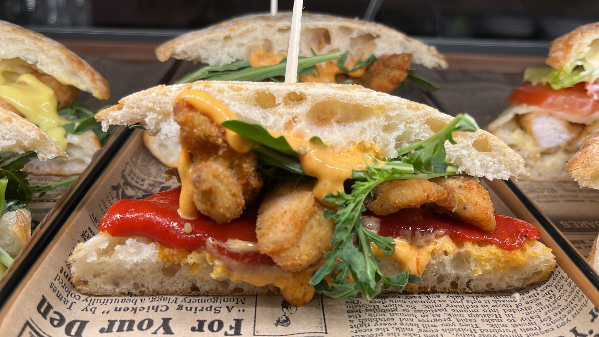 Tiras de pollo crujiente, lechuga, tomate, cebolla frita y queso zamorano en pan de cristal cuadrado