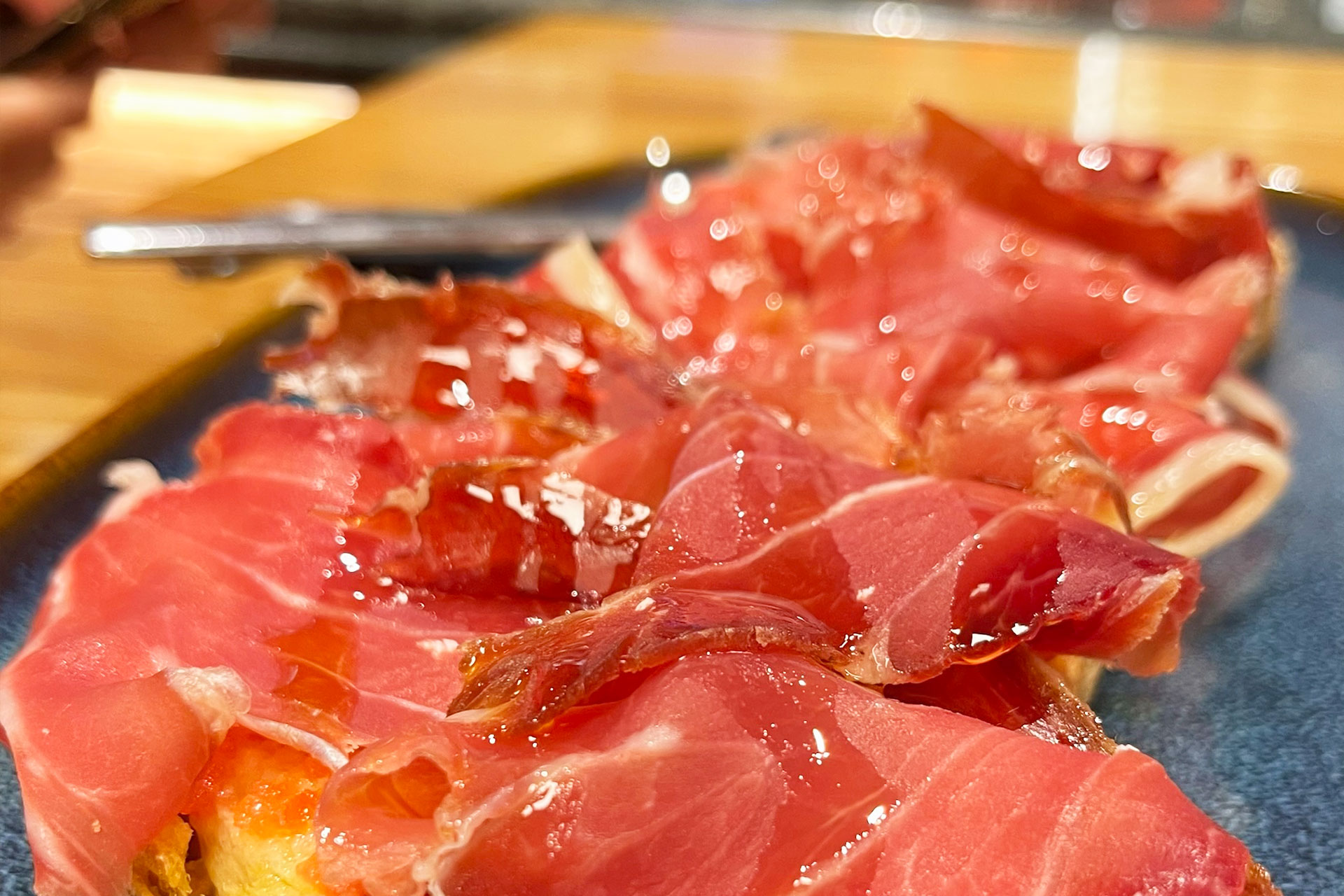 Jamón serrano, queso tetilla, patatas y pimientos asados en casa